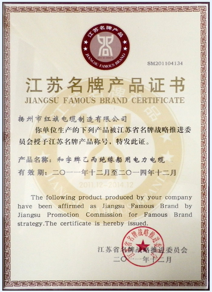 江苏省名牌产品证书