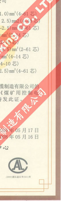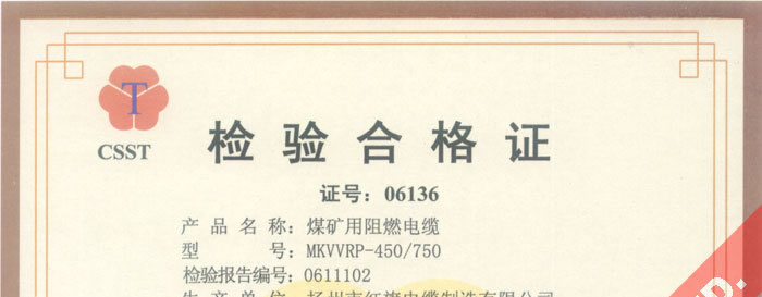 国家采煤机械质量监督检验中心检验合格证--煤矿用阻燃电缆(MKVVRP-450/750)
