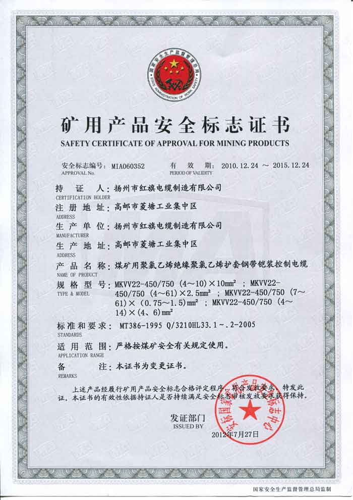 煤矿矿用产品安全标志证书-MKVV22